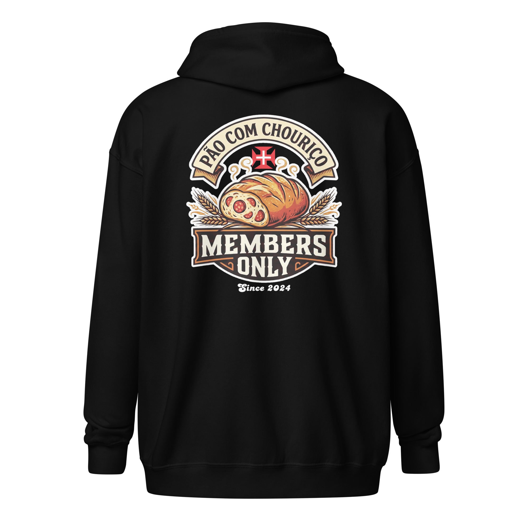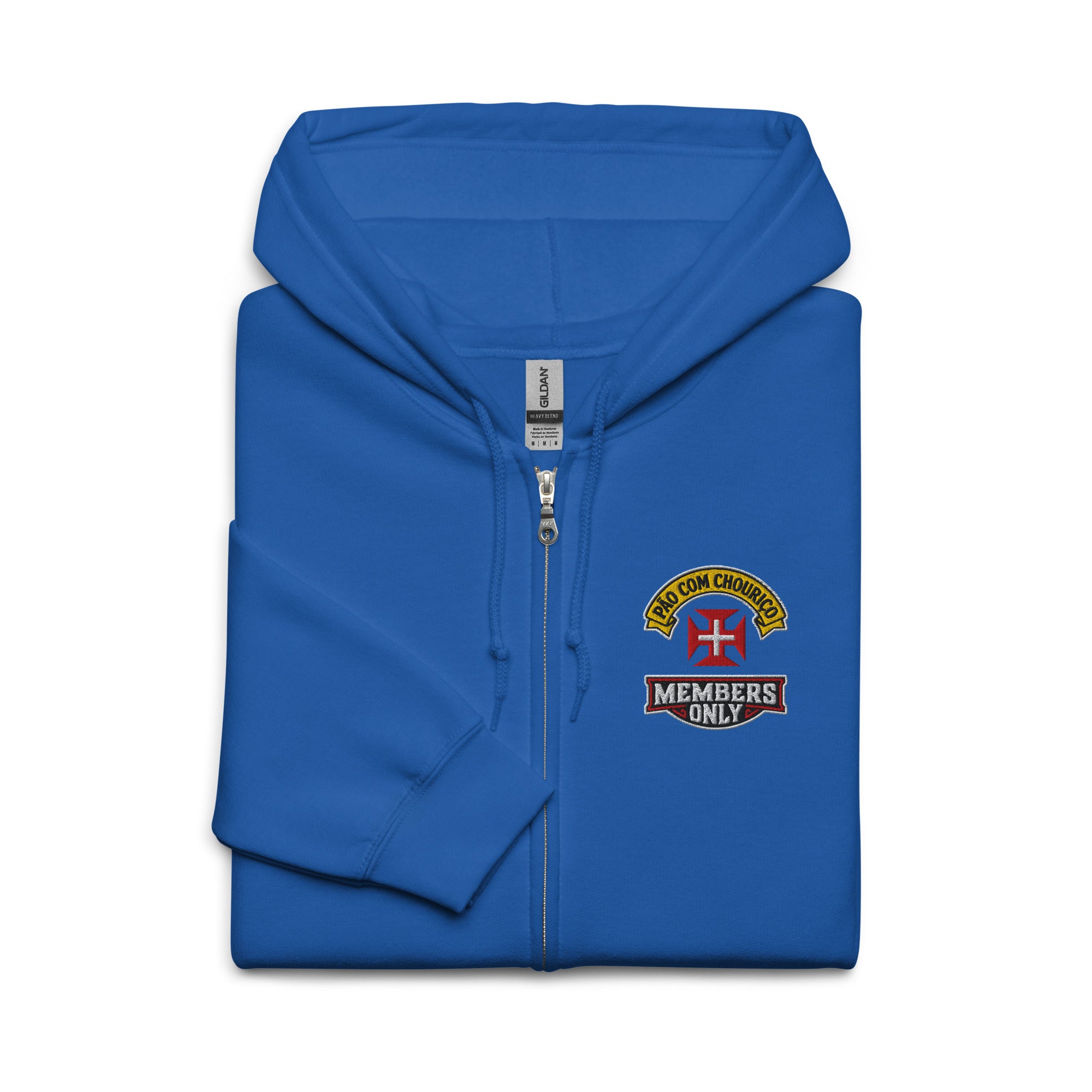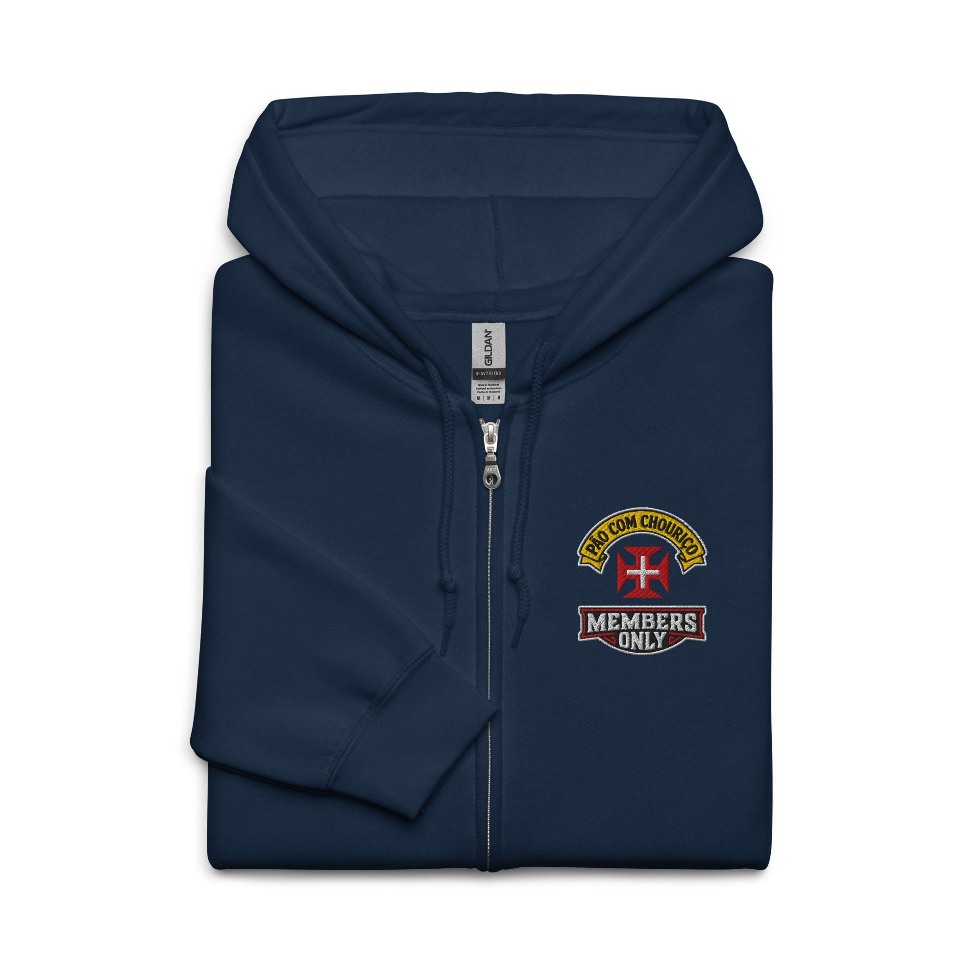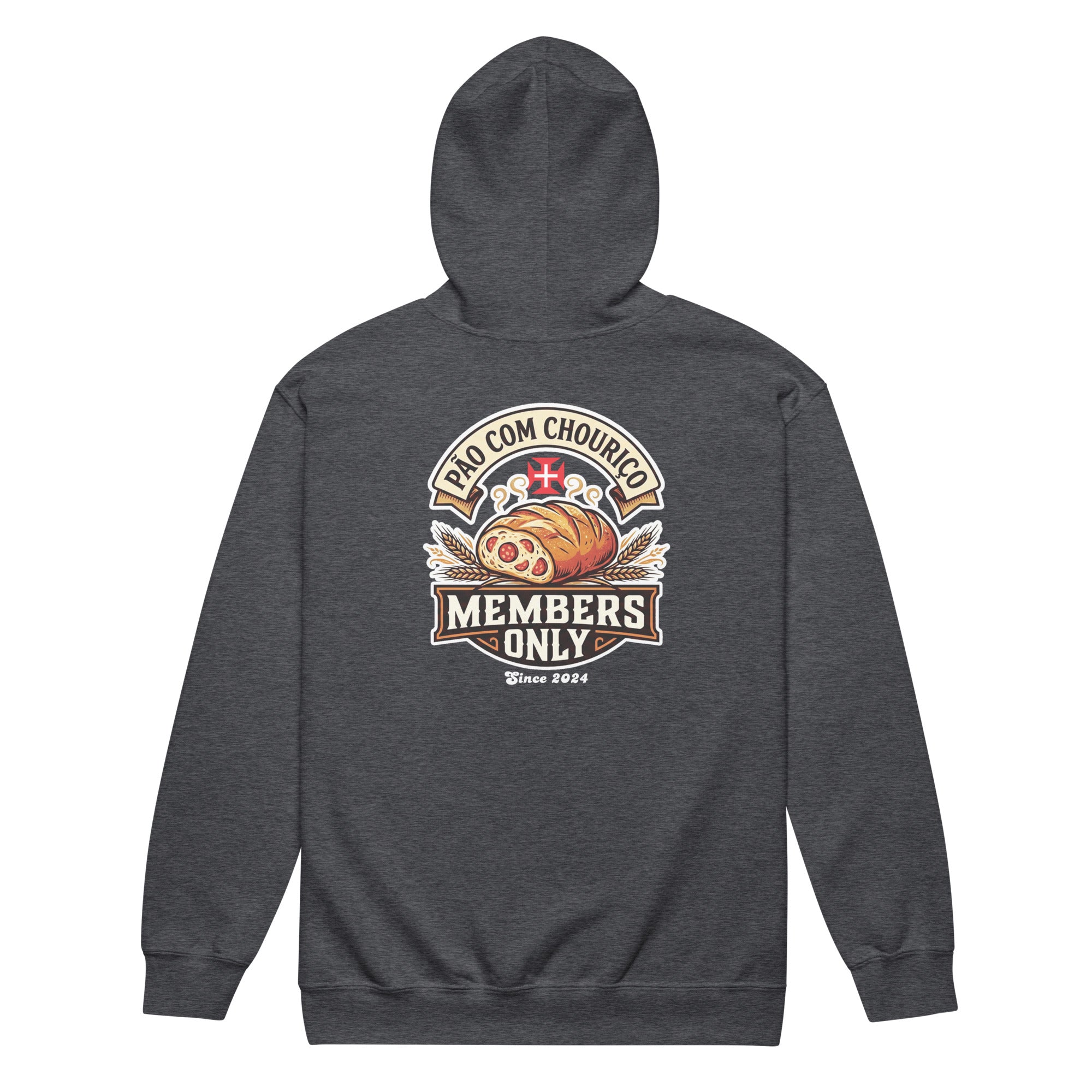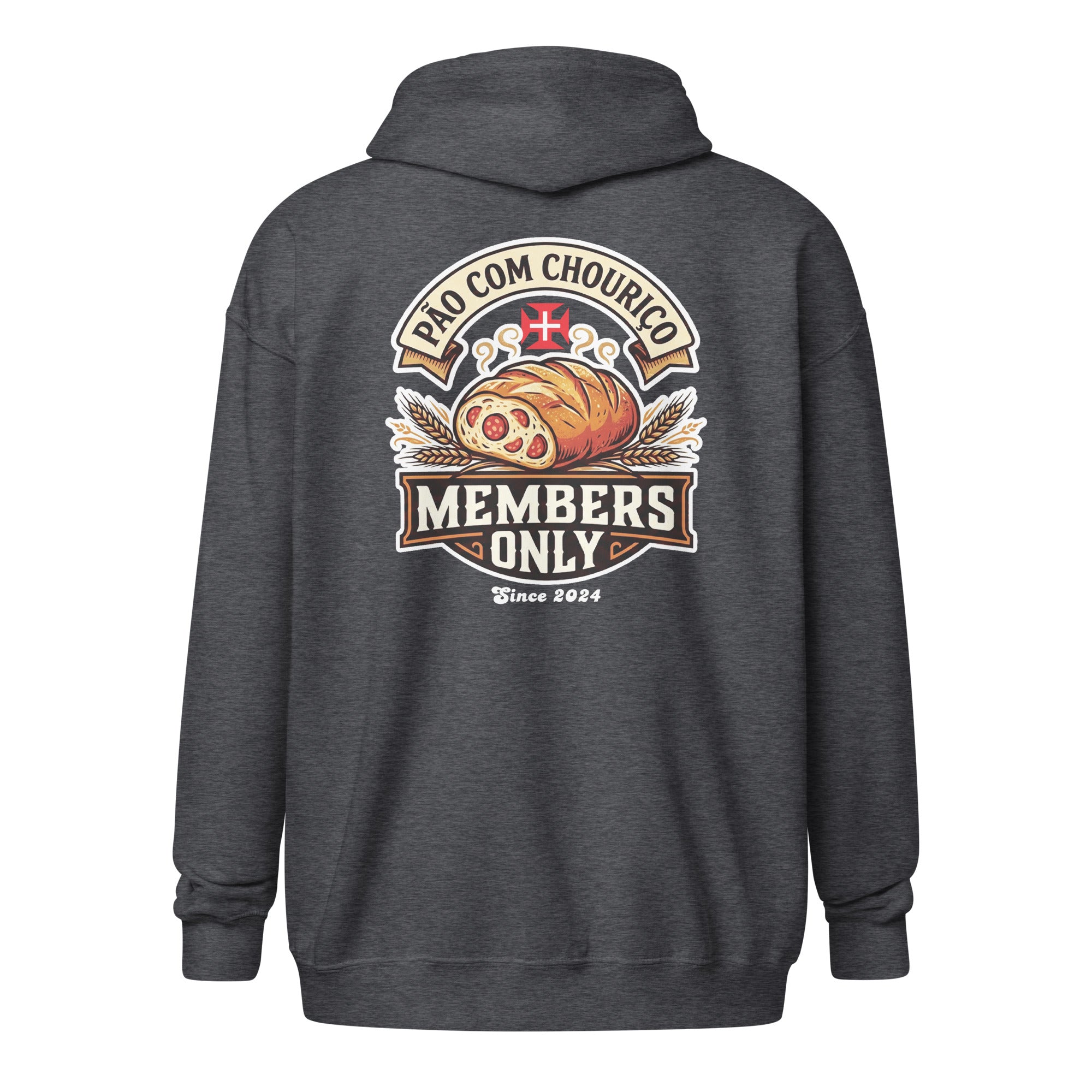 Pão Com Chouriço® Members Only Unisex heavy blend zip hoodie. Designed with style and comfort in mind, this hoodie will quickly become your new favorite. It’s made from soft fleece inside and outside, with a sturdy metal zipper, convenient front pockets, and a hood with color-matched drawstrings.