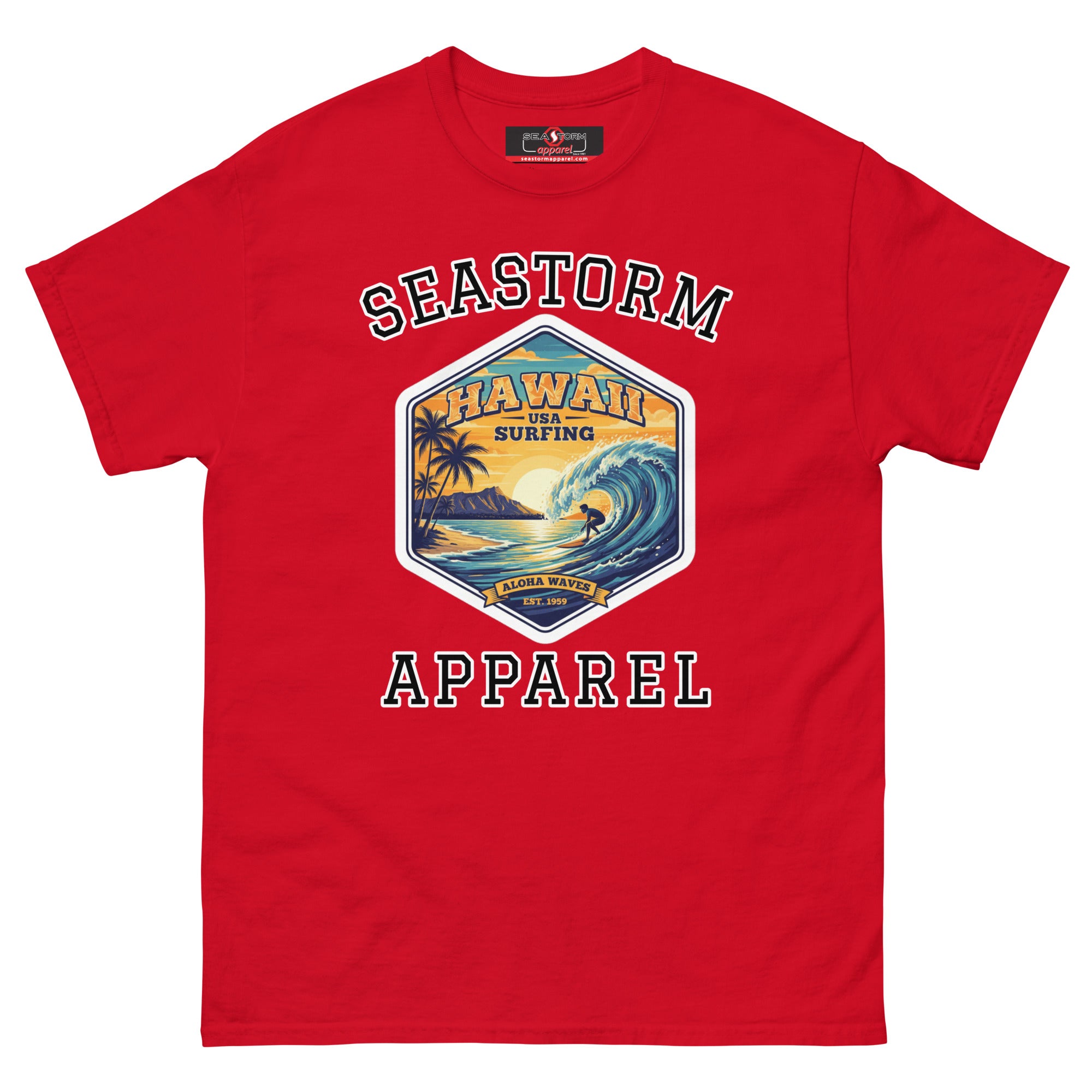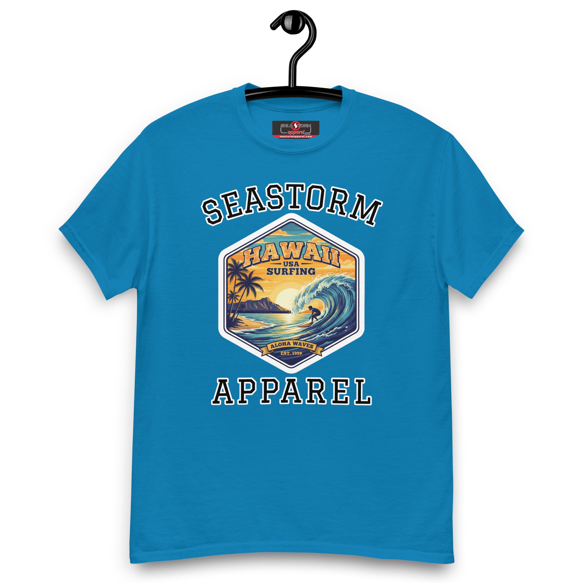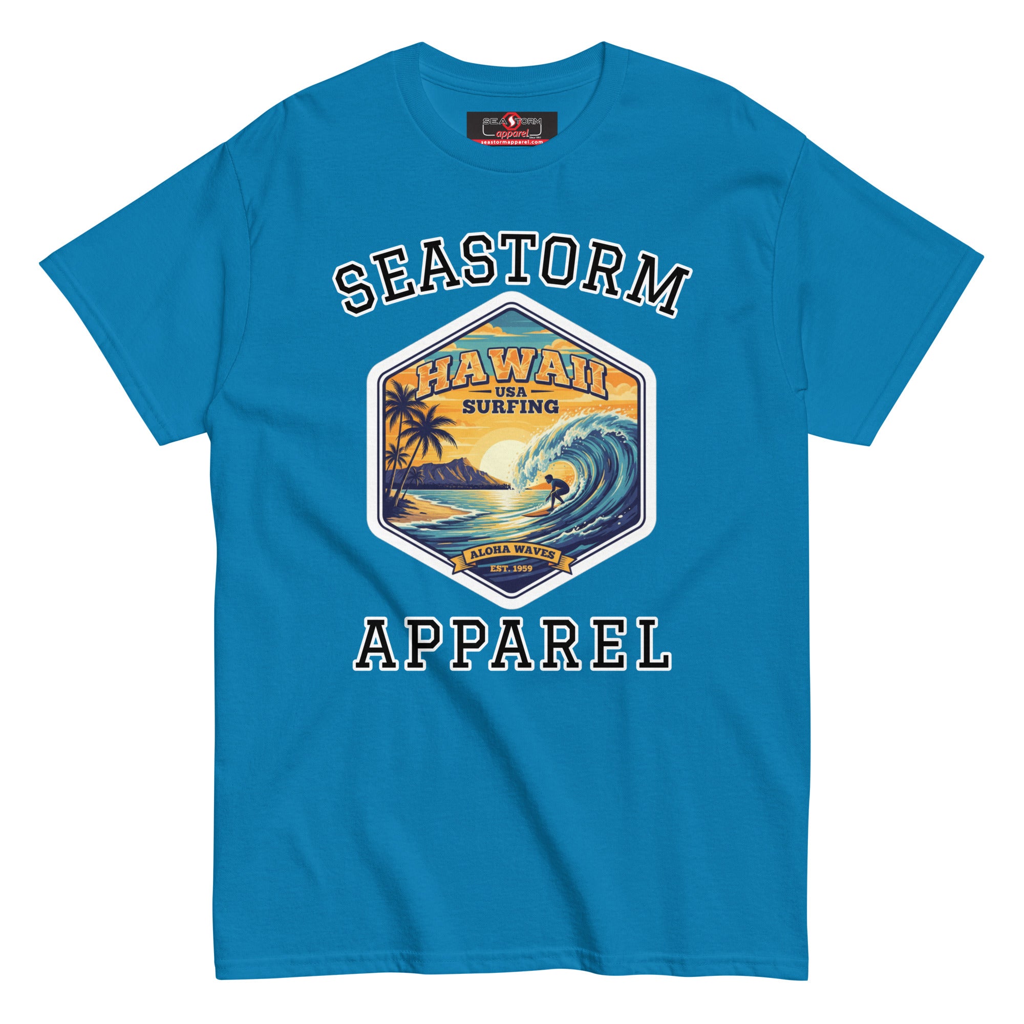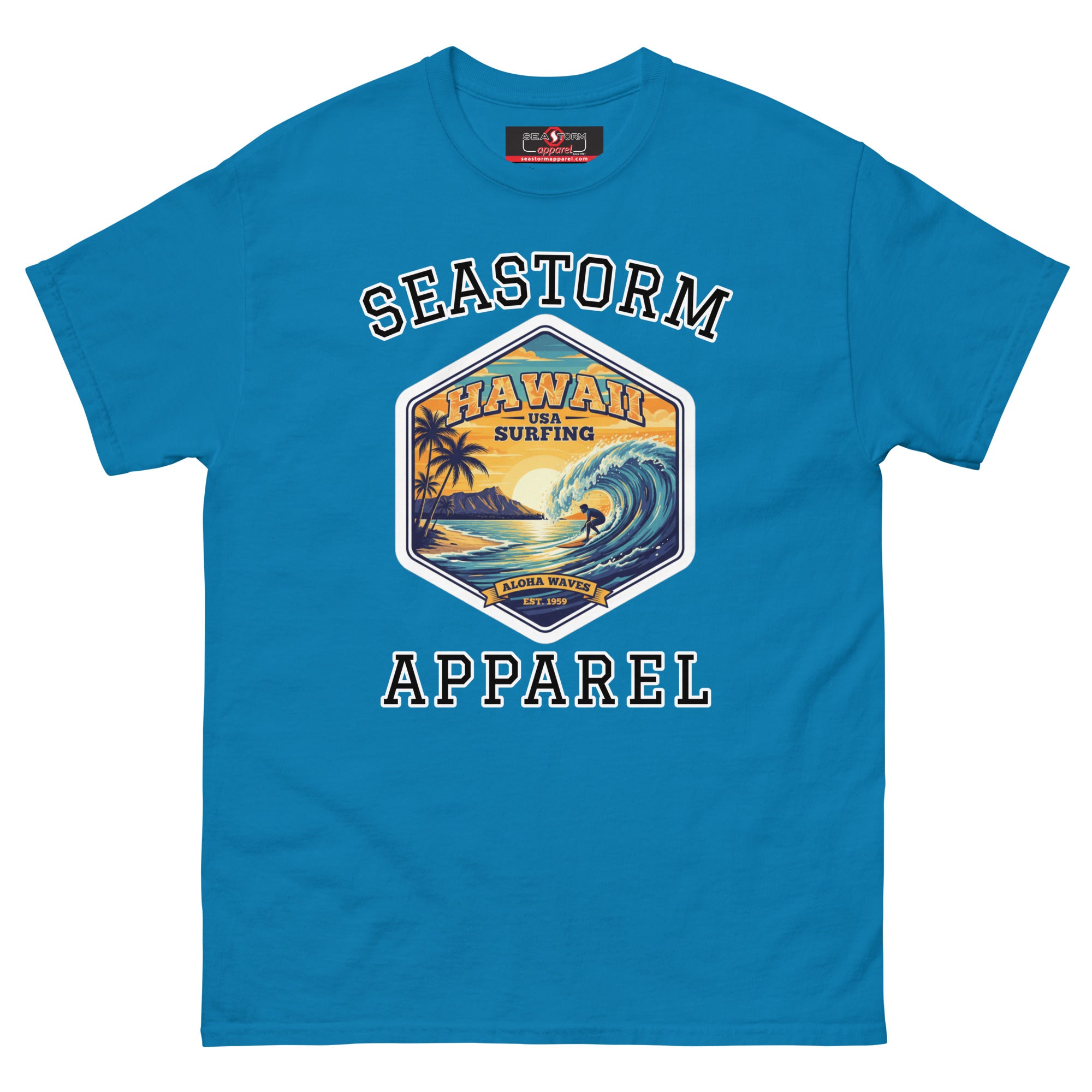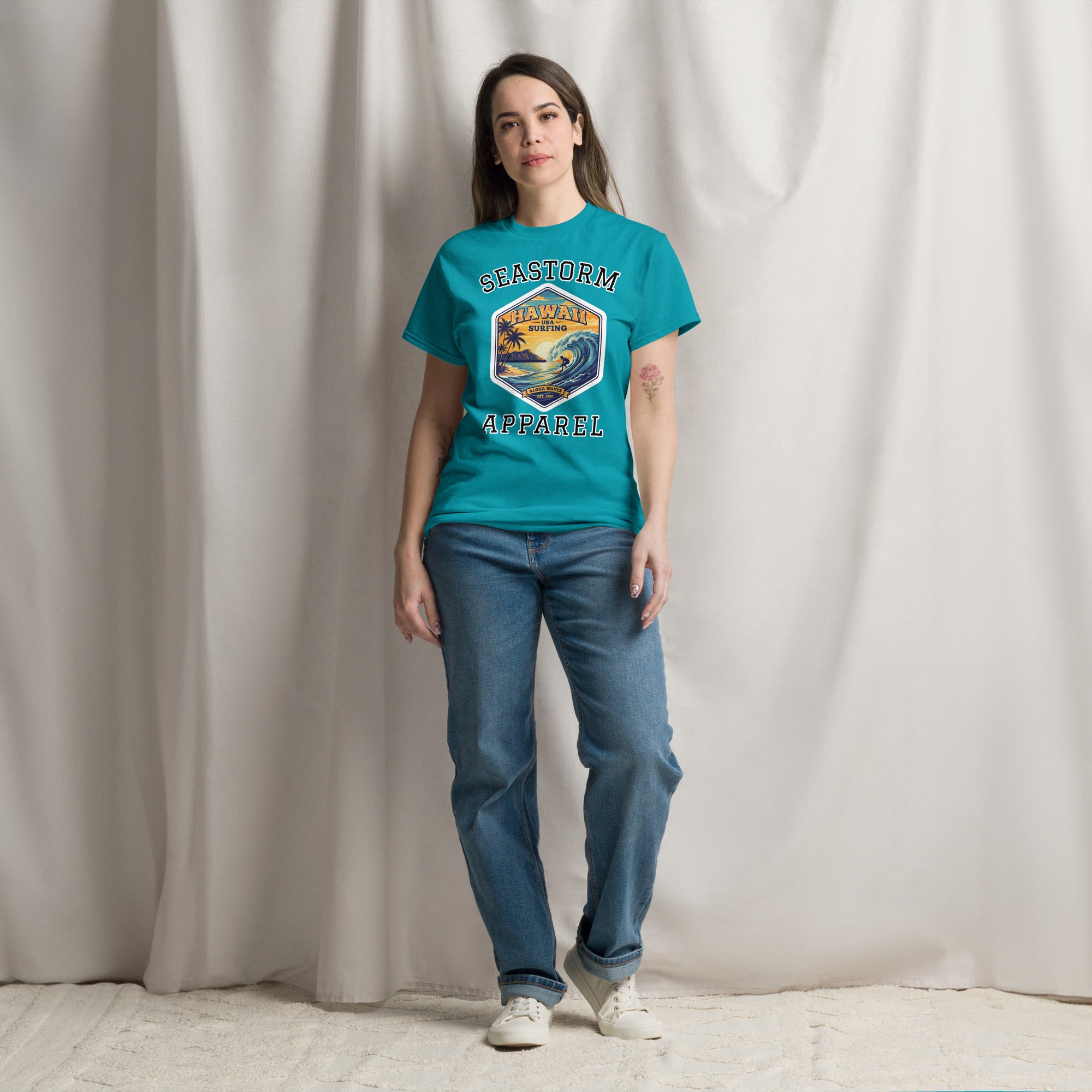 The 100% cotton Hawaii Surfing USA Seastorm Apparel® premium unisex classic tee, will help you land a more structured look. It sits nicely, maintains sharp lines around the edges, and goes perfectly with layered streetwear outfits. Plus, it's extra trendy now!