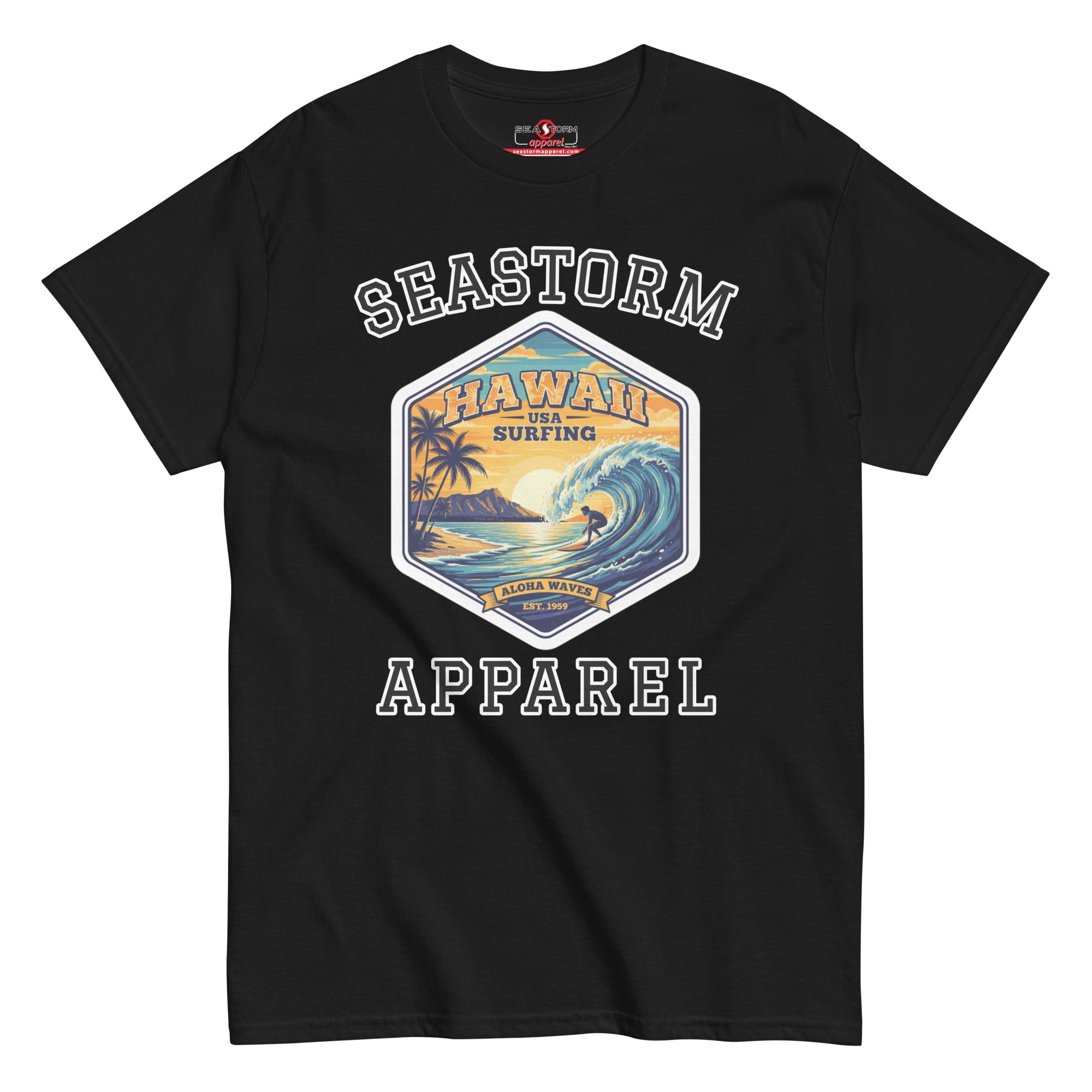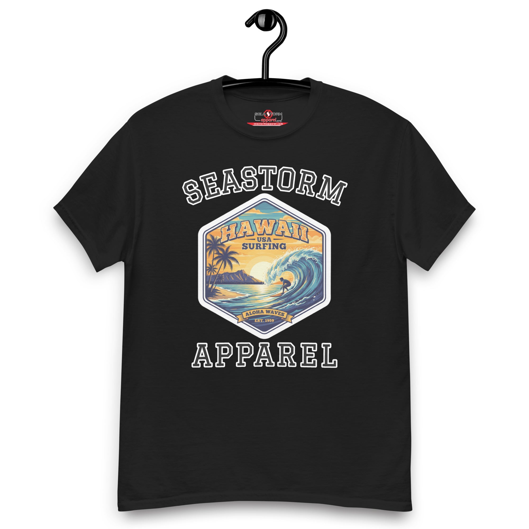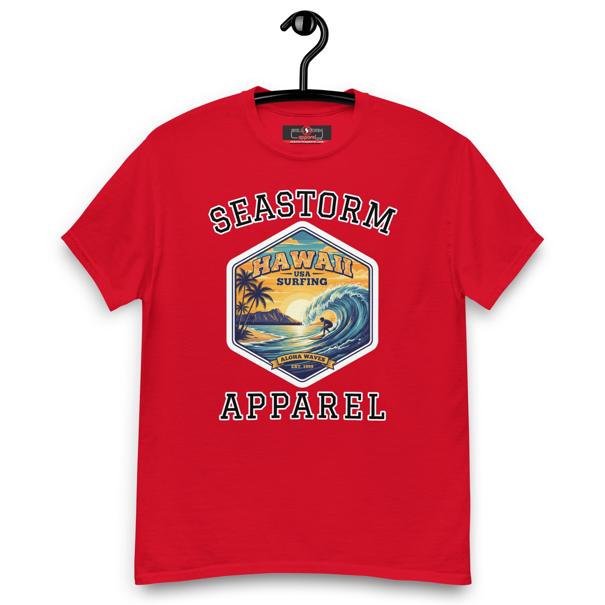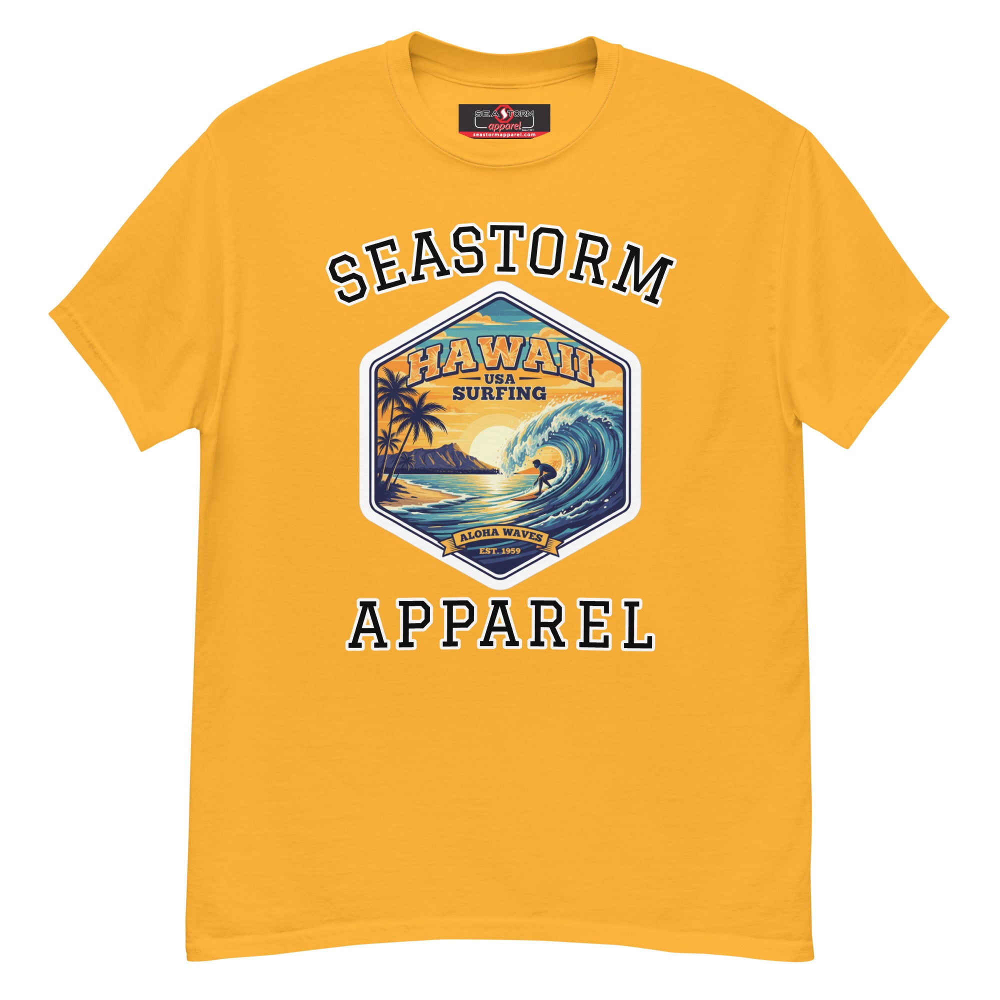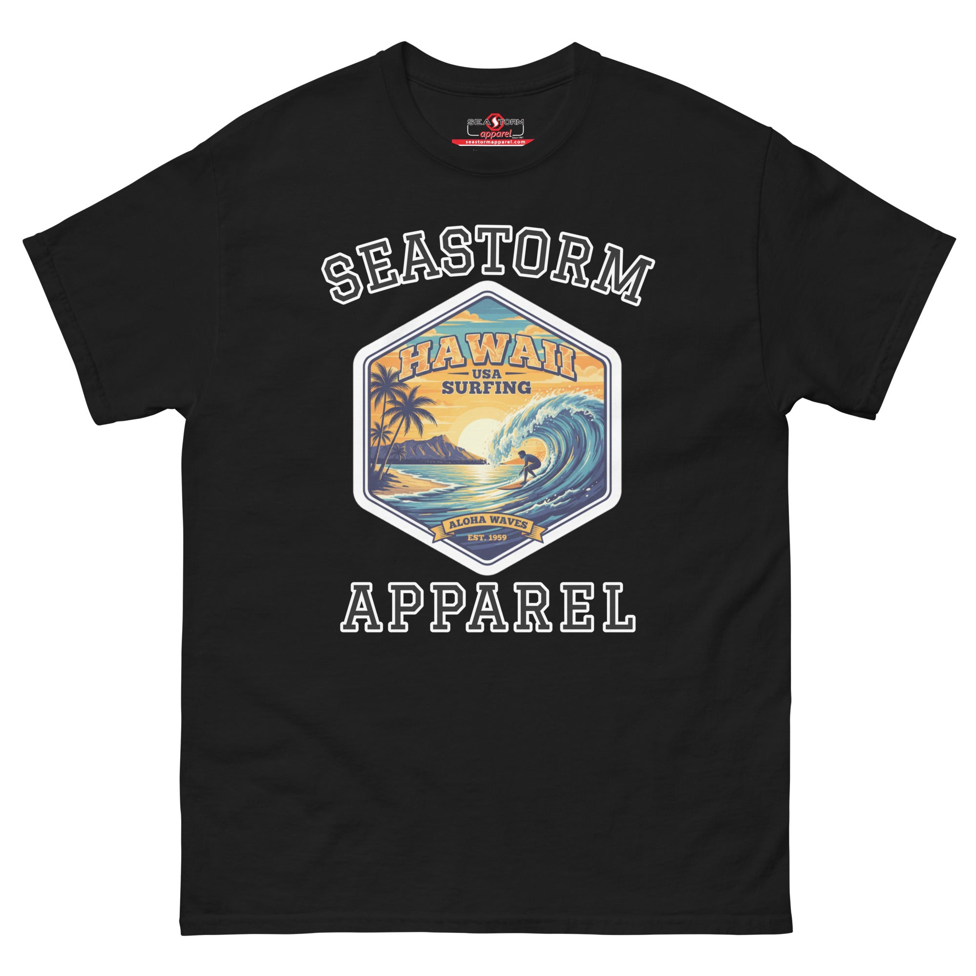 The 100% cotton Hawaii Surfing USA Seastorm Apparel® premium unisex classic tee, will help you land a more structured look. It sits nicely, maintains sharp lines around the edges, and goes perfectly with layered streetwear outfits. Plus, it's extra trendy now!