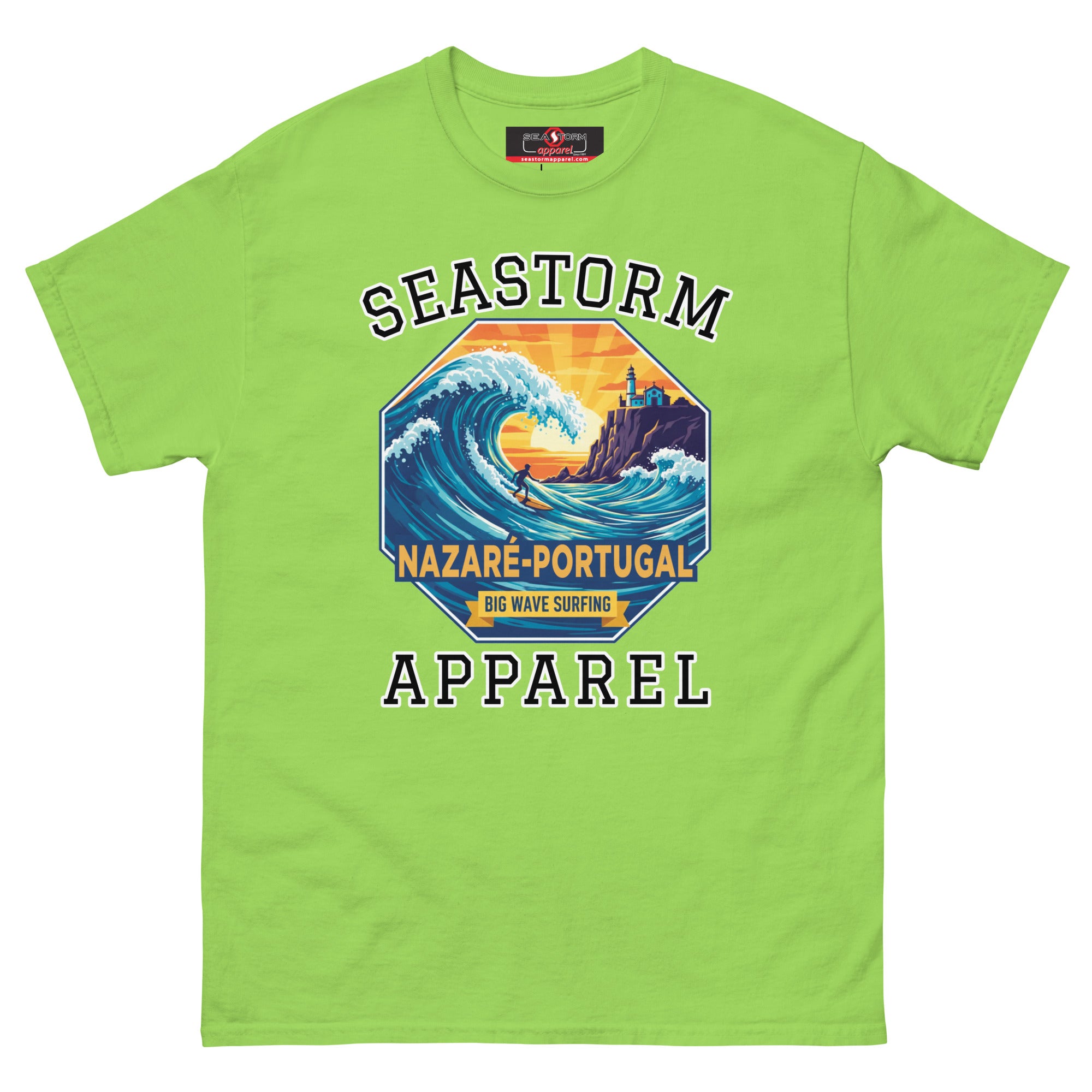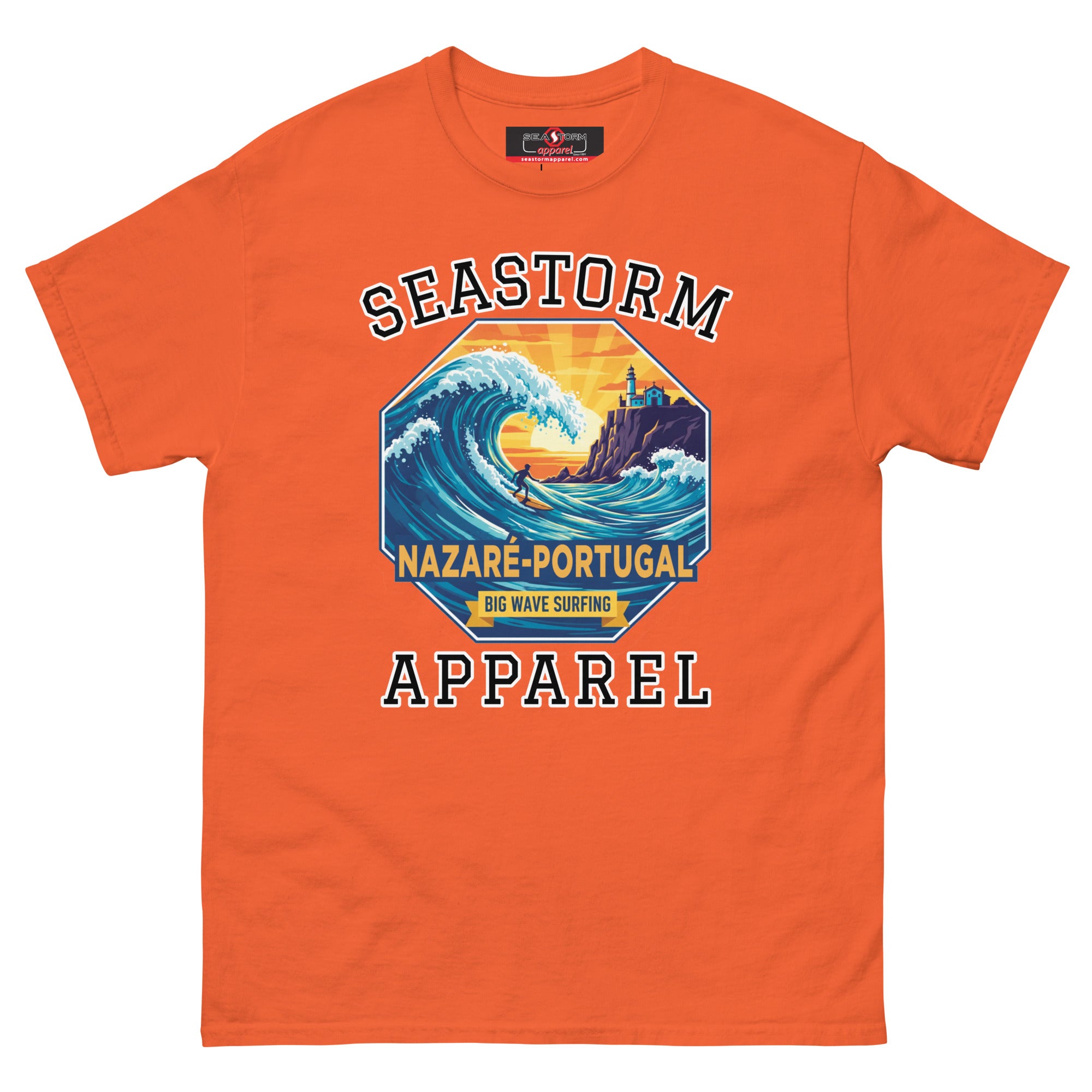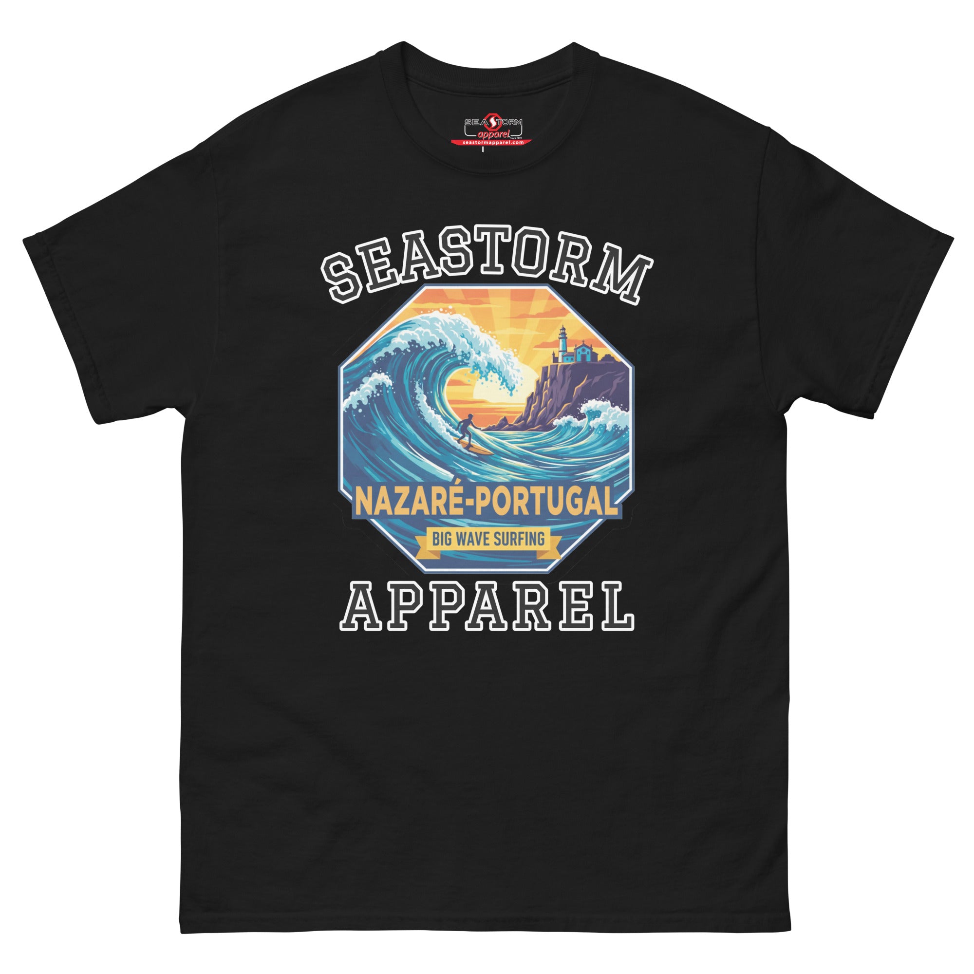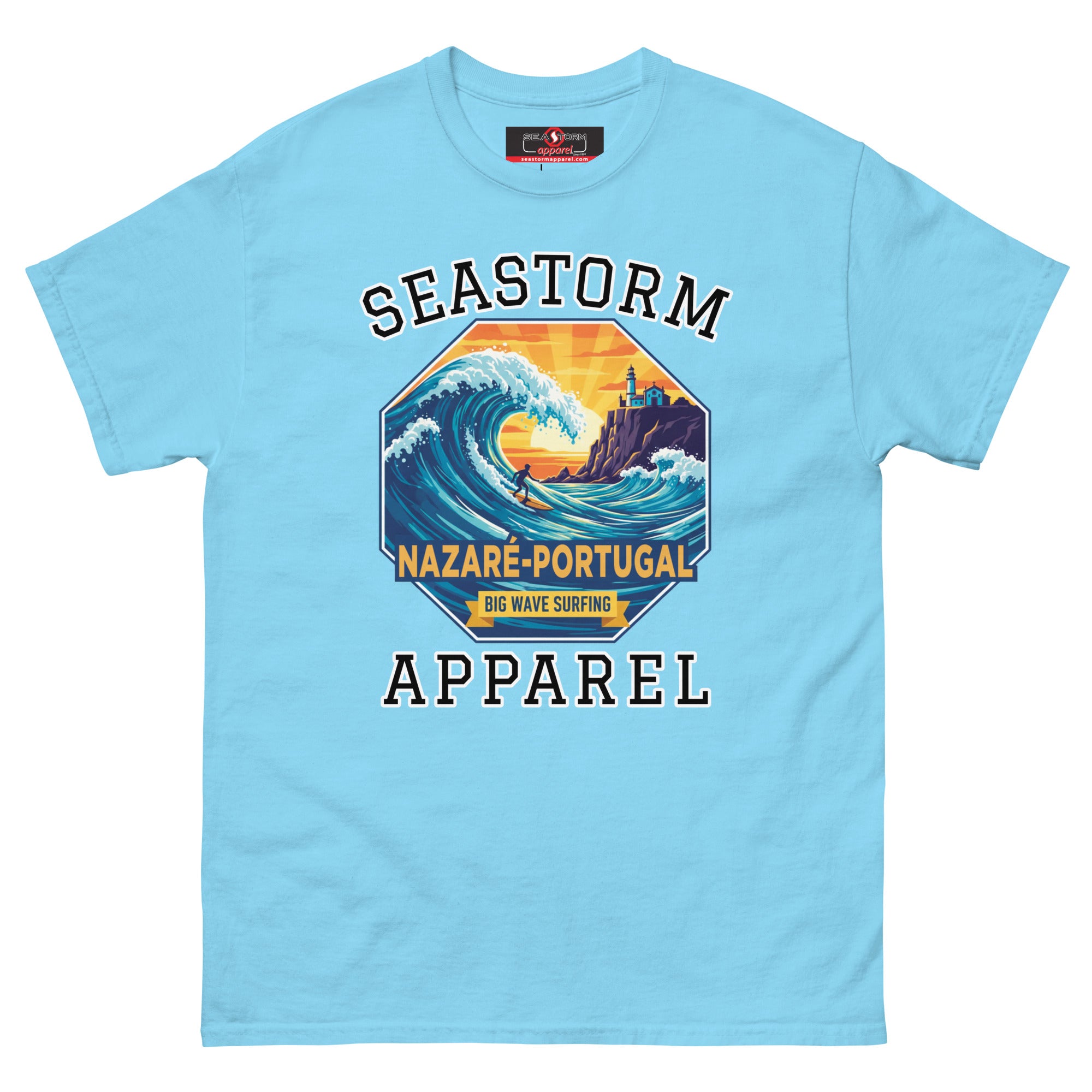 The Nazaré Portugal Seastorm Apparel® 100% cotton unisex premium tee, will help you land a more structured look. It sits nicely, maintains sharp lines around the edges, and goes perfectly with layered streetwear outfits. Plus, it's extra trendy now!